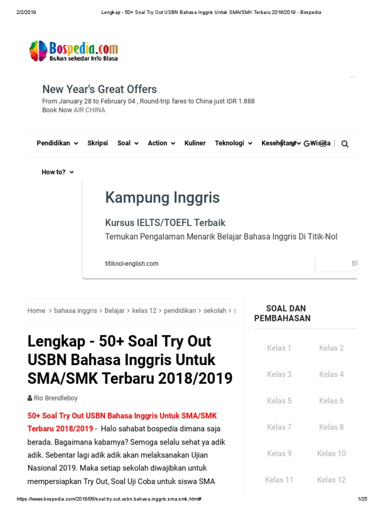 Lengkap 50 Soal Try Out Usbn Bahasa Inggris Untuk Sma Smk Terbaru 2018 2019 Bospedia